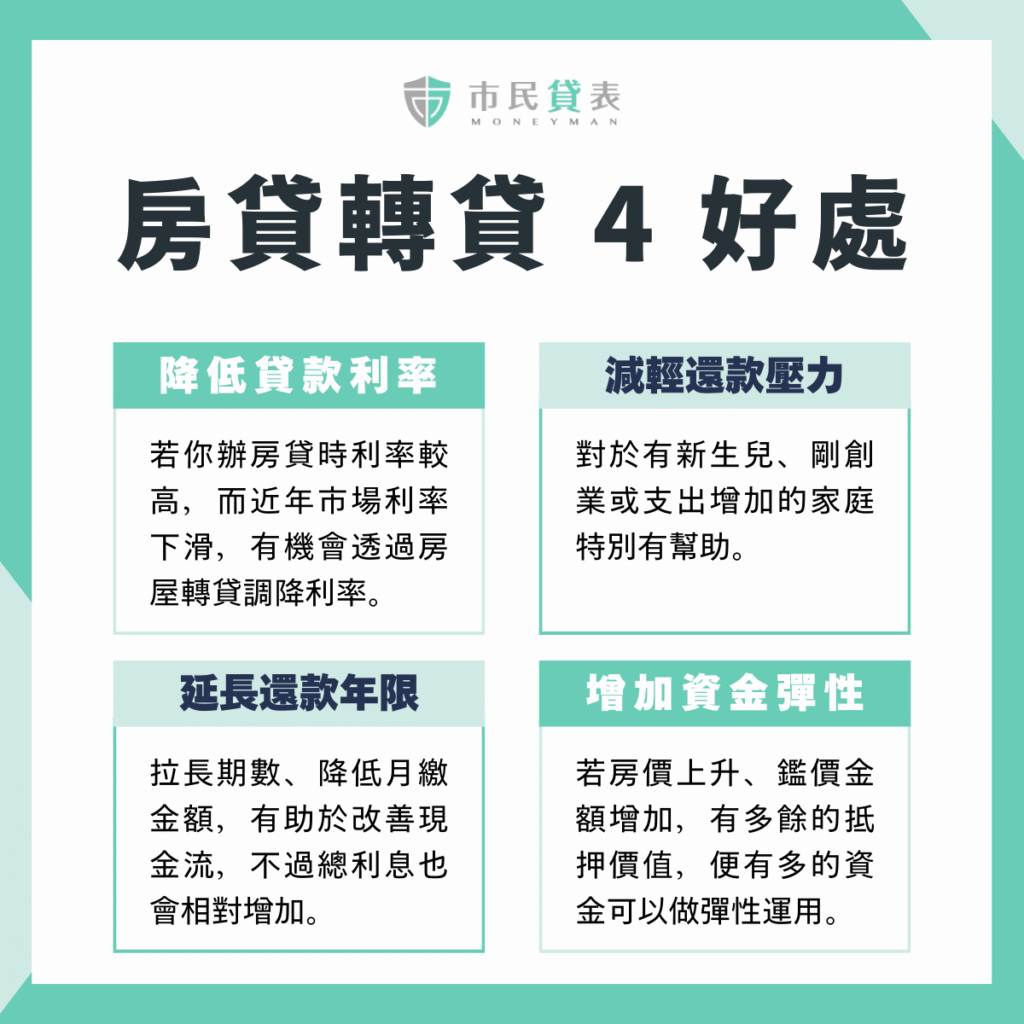 在辦理房屋轉貸時,會重新鑑價房屋,若目前房價上升、鑑價金額增加,有多餘的抵押價值,就有機會提高總借款金額,這樣的房貸轉貸好處,是可以彈性使用多出來的貸款,例如:房屋裝修、購車、醫療、子女教育或創業周轉…等,與信貸相比利率較低,也能集中債務更好管理。