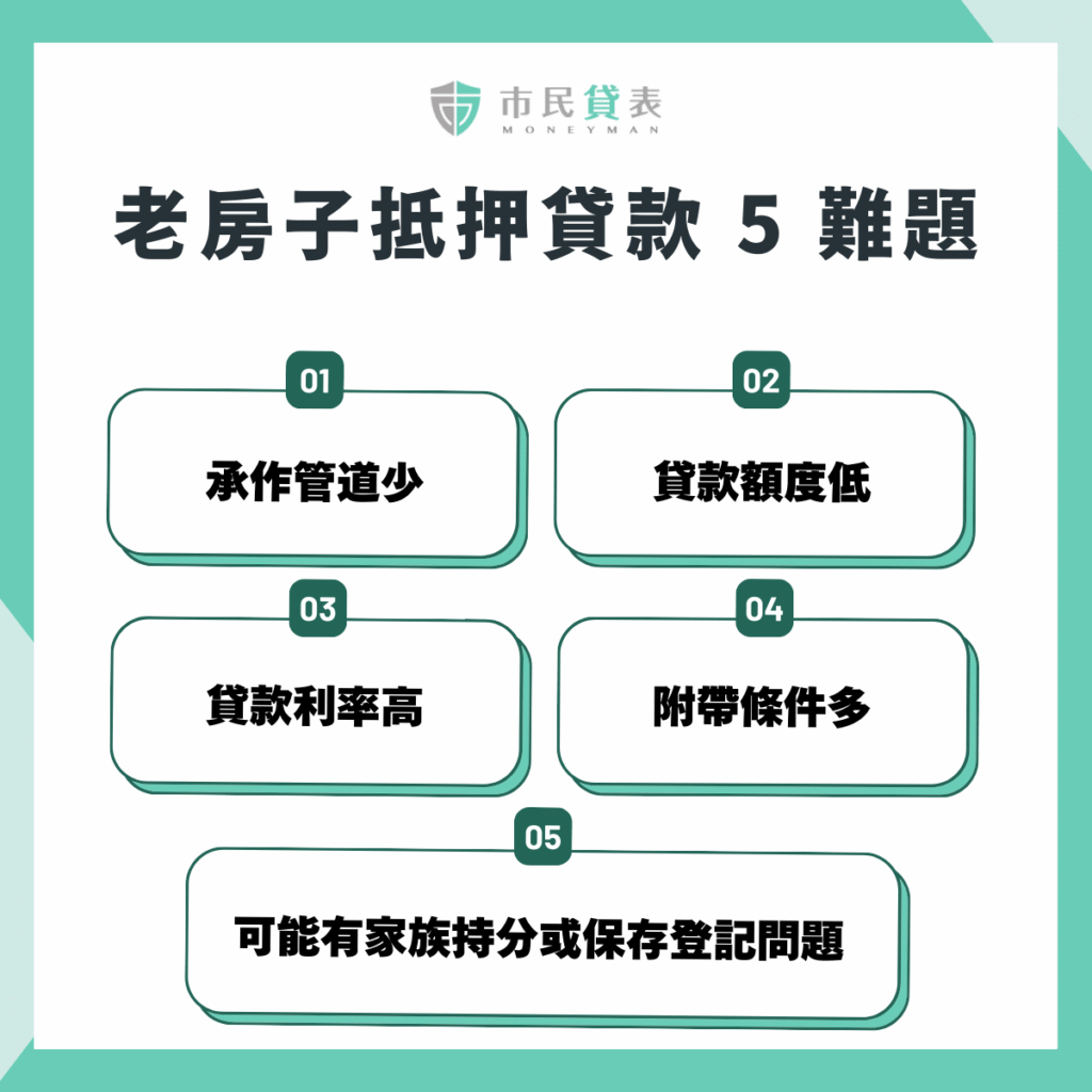 - 民間貸款:承作彈性高,但老房子抵押貸款利率偏高。